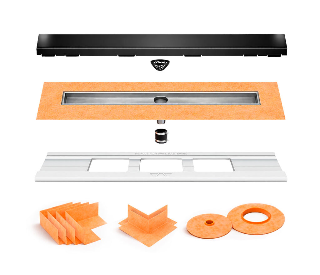 - Complete linear shower drain kit includes all components for installation: stainless steel channel body drain, adjustable linear grate assembly, 4 KERDI preformed inside corners, 2 outside corners, Schluter pipe seal (KMS172/20), and mixing valve seal (KMSMV235/114) for reliable waterproofing protection