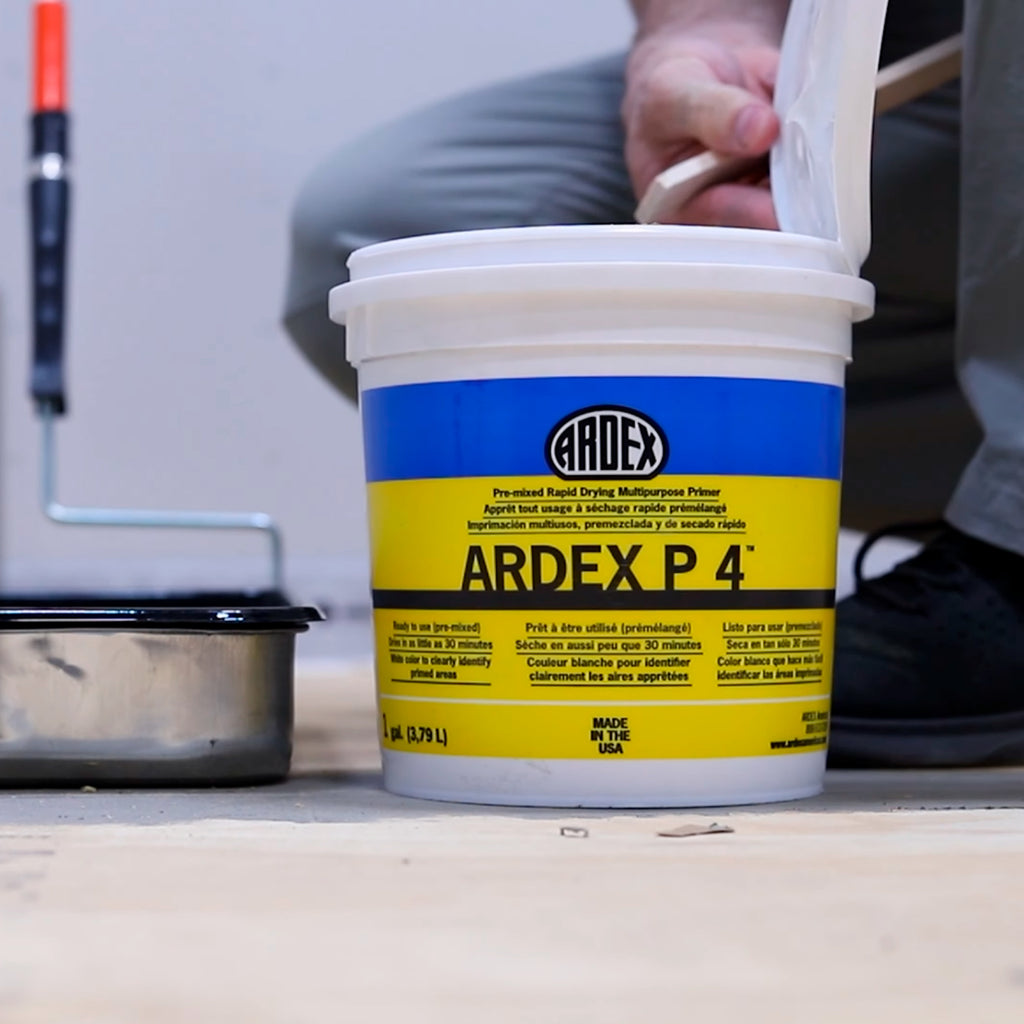 - Ardex P 4 primer features a drip-free, splash-free consistency that prevents messes and eliminates waste. It is suitable for use over multiple common substrates, including concrete slabs, plywood subfloors, gypsum, cement screeds, terrazzo, autoclaved aerated concrete (AAC), and existing tiles.