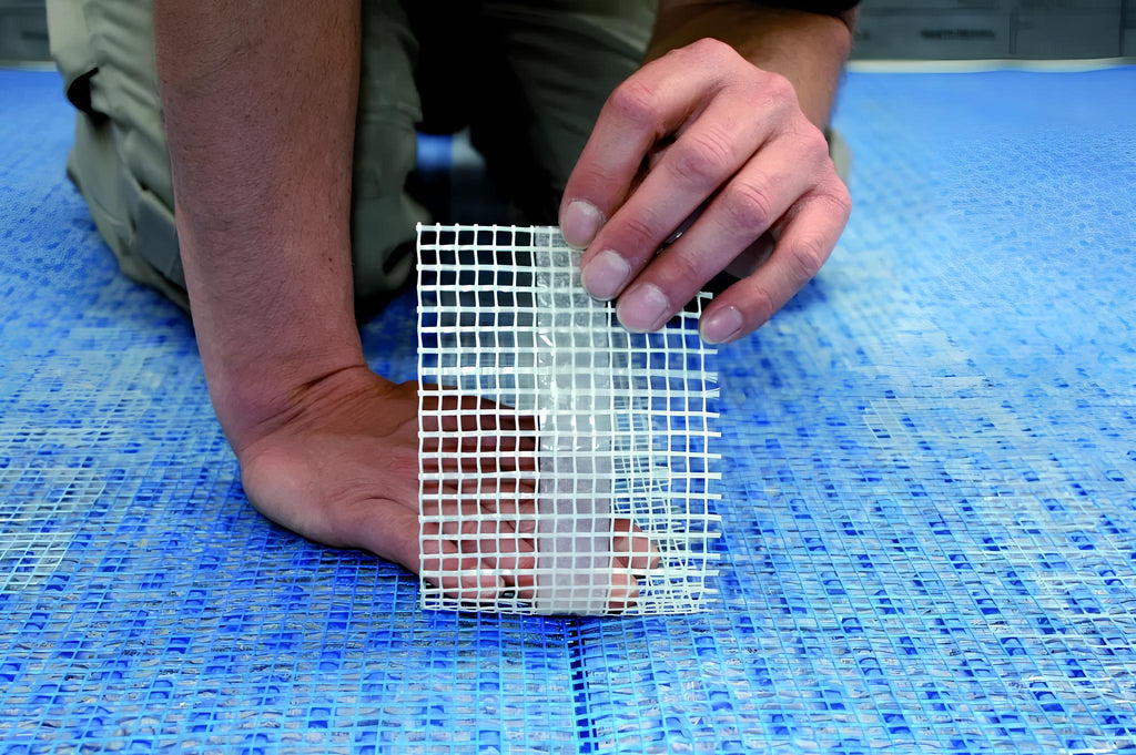 The UD 158 is especially useful when merging two sections of the ARDEX 720 Flexbone Underlayment that have been cut along its 39-inch width. The Flexbone Underlayment itself features an integrated mesh on one side of the roll, which runs the full length of the membrane, making it convenient for connecting longer runs in straightforward installations. For instance, in a 14-foot room, two sections of Flexbone can be seamlessly joined along the 14-foot side using the built-in mesh, allowing for a streamlined and simple installation process.