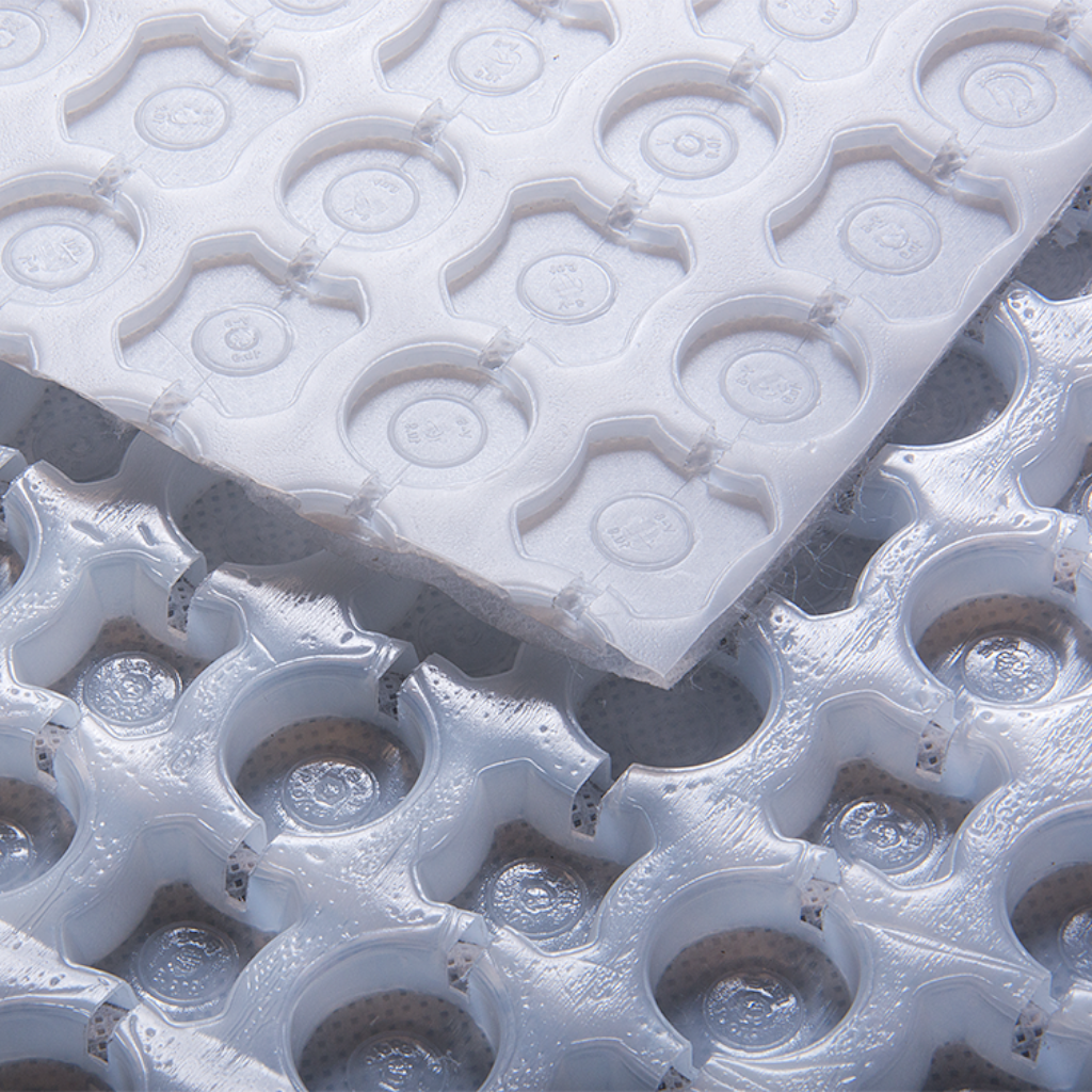 - Its instant coverage verification allows for installer to see mortar coverage underneath the mat during installation without having to lift and verify.
