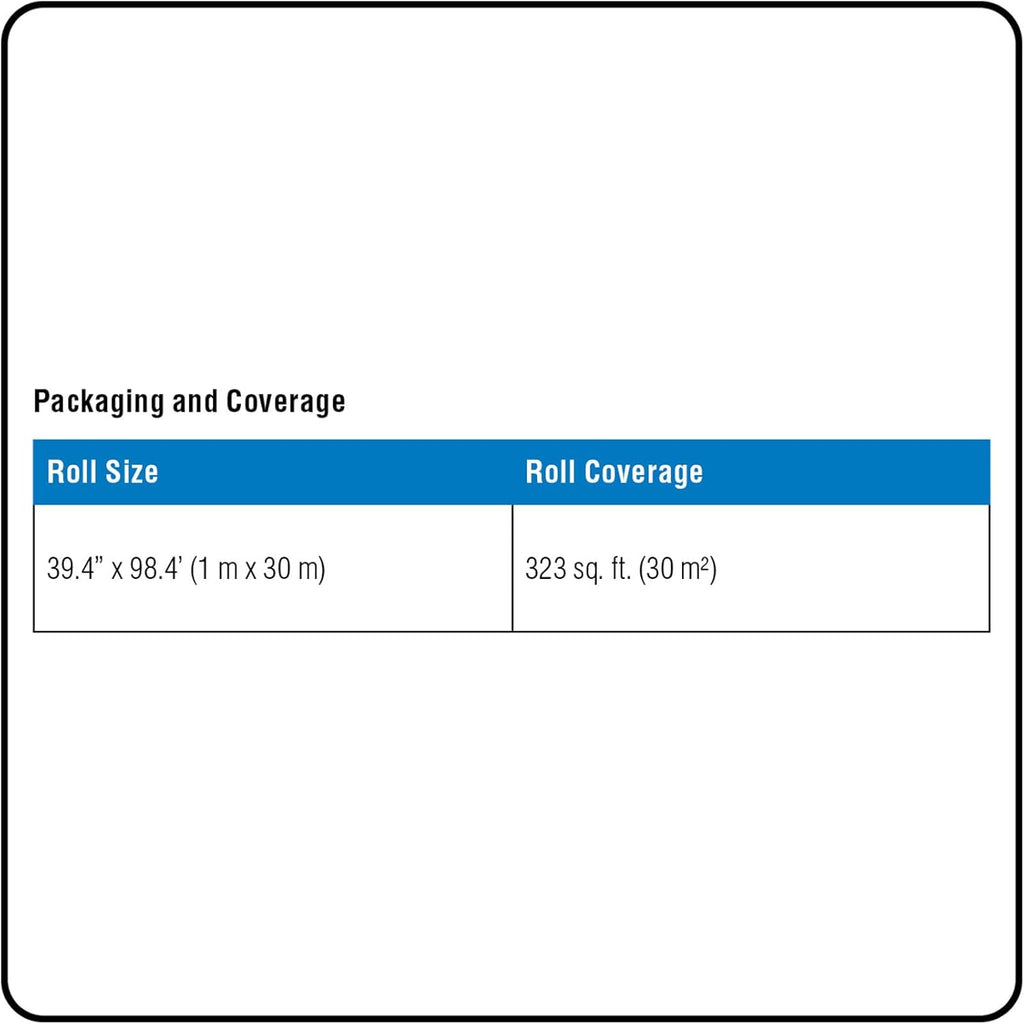 Dimensions – Mapeguard UM 94285-30 polypropylene membrane roll is 1/8" (3 mm) thick and covers 323 Sq Ft (30 Sq M)
