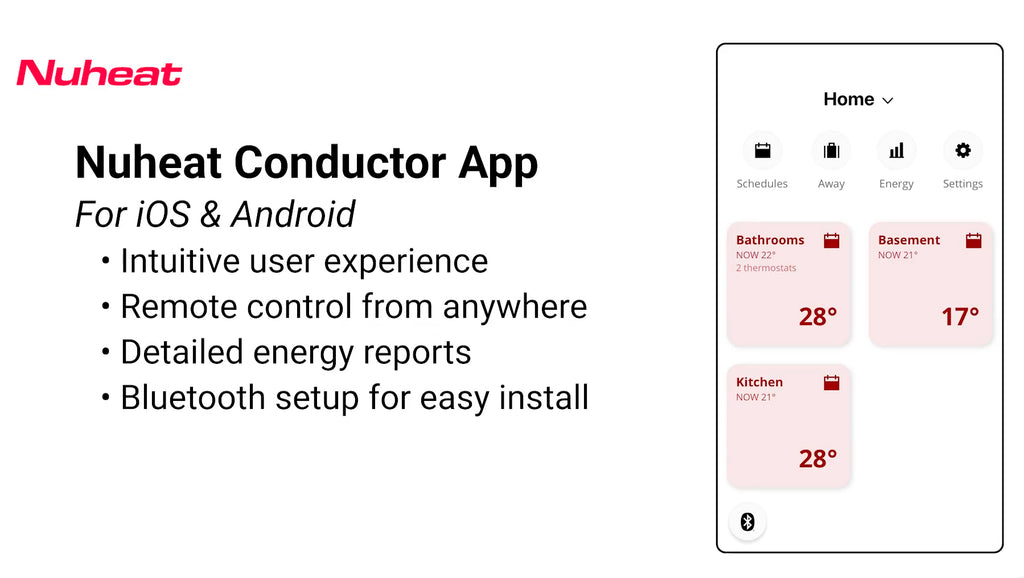 The Chemelex nVent NUHEAT Conductor Smart Electric Floor Heating Thermostat is a next-generation smart thermostat designed for precise, energy-efficient control of electric radiant floor heating systems. With advanced Wi-Fi and Bluetooth connectivity, it offers seamless remote operation, flexible scheduling, and future-proof over-the-air firmware updates. Whether you're managing heat in a single room or multiple zones, the NUHEAT Conductor allows remote control of multiple devices and locations using intuitive iOS and Android apps. Initial setup is quick and easy via Bluetooth—even without Wi-Fi.