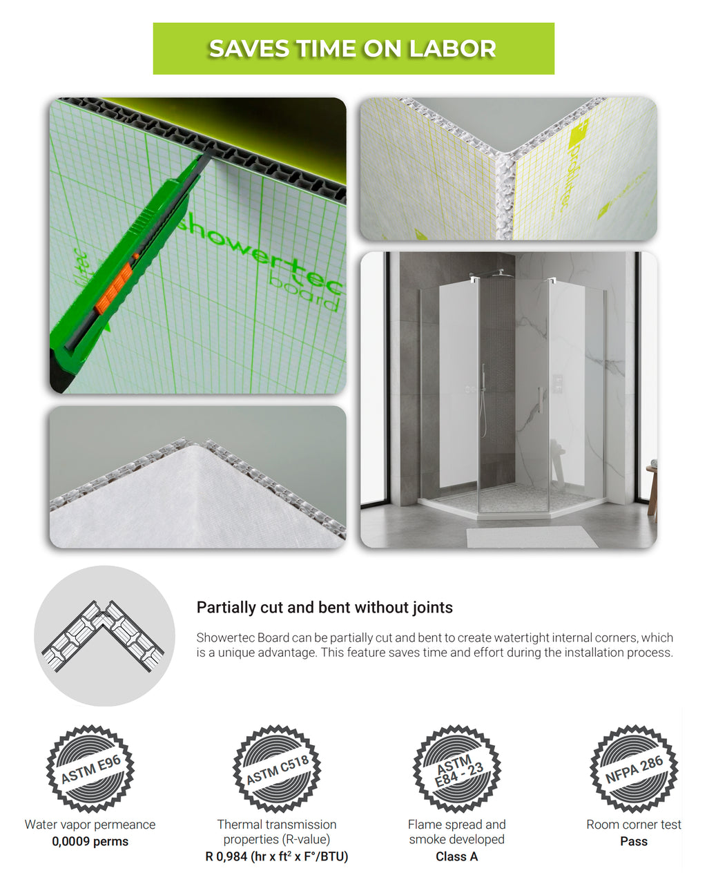 It complies with ANSI and TCNA standards for vapor-resistant substrate and bonded waterproof membrane systems and passes ASTM E84 and NFPA 286 for flame and smoke resistance, with a low water vapor permeance of 0.0009 perms and thermal R-value around 0.984. This makes it suitable for high-moisture and high-temperature environments, including steam showers, commercial washrooms, tub surrounds, walk-in showers, curbless shower floors, ADA barrier-free installations, gyms, hotels, fitness centers, luxury homes, and wet room applications.