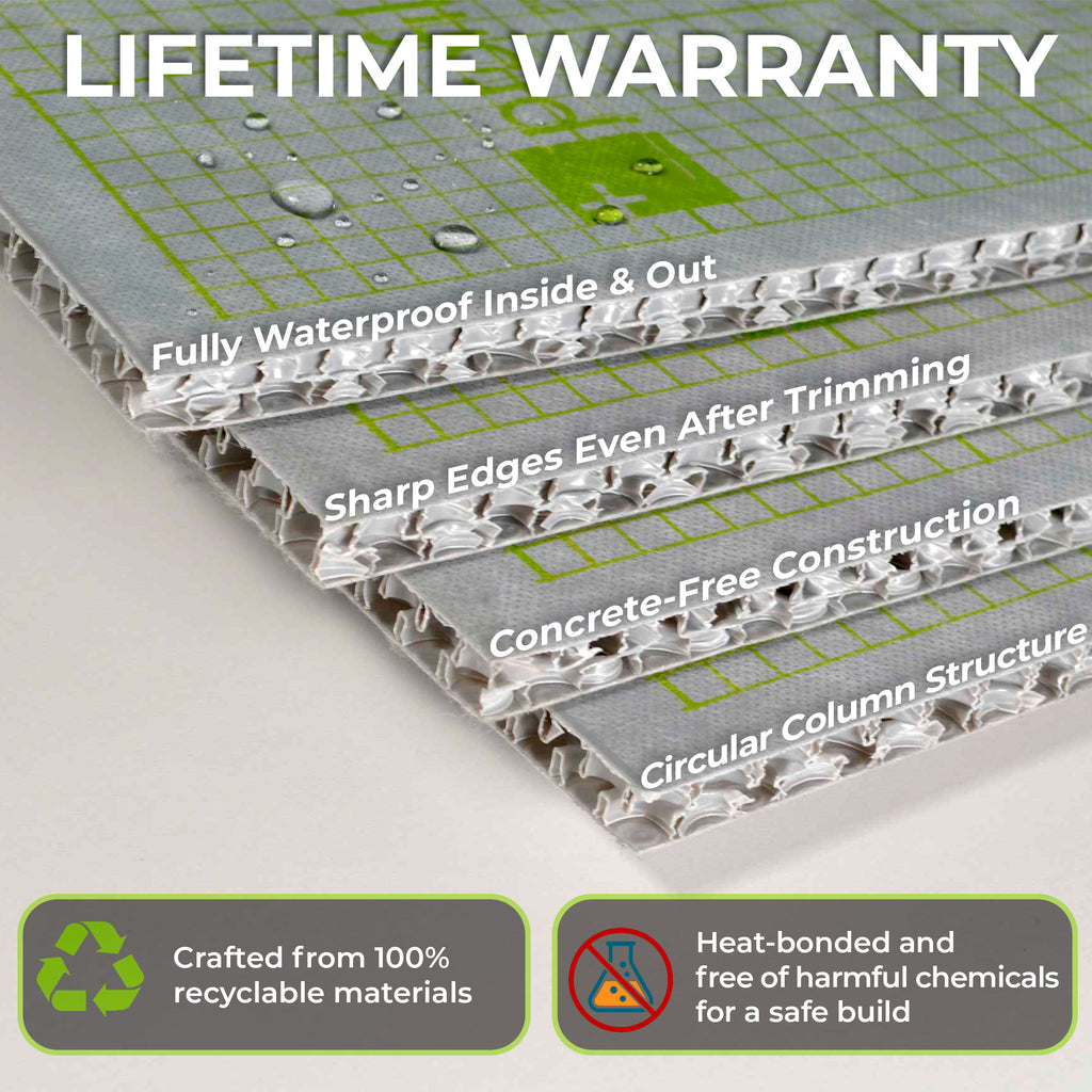 This waterproof construction panel features a unique internal cell-structured design that enhances high compressive strength, allows for easy scoring to create custom shapes like construction board for benches and niches, and ensures zero residue is left when cut. The printed 10 mm grid pattern ensures precise cutting and layout alignment using a standard utility knife or jigsaw. Lightweight and dimensionally stable, it eliminates the need for heavy cement board, reducing labor time and simplifying handling on the jobsite.