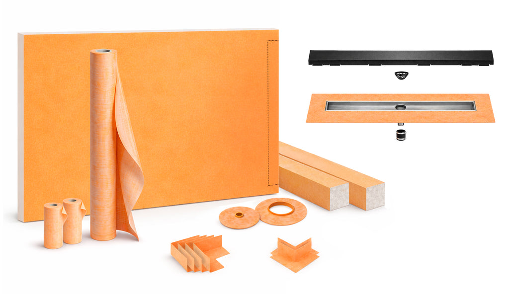 The Schluter Kerdi complete shower kit is an all-inclusive package containing the components required to easily create a watertight shower enclosure (assembly).
