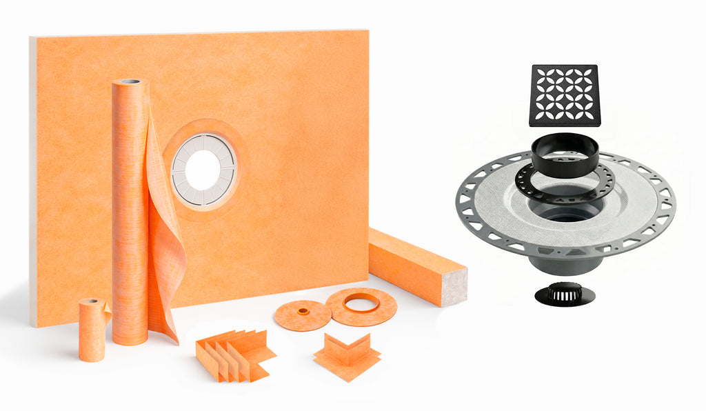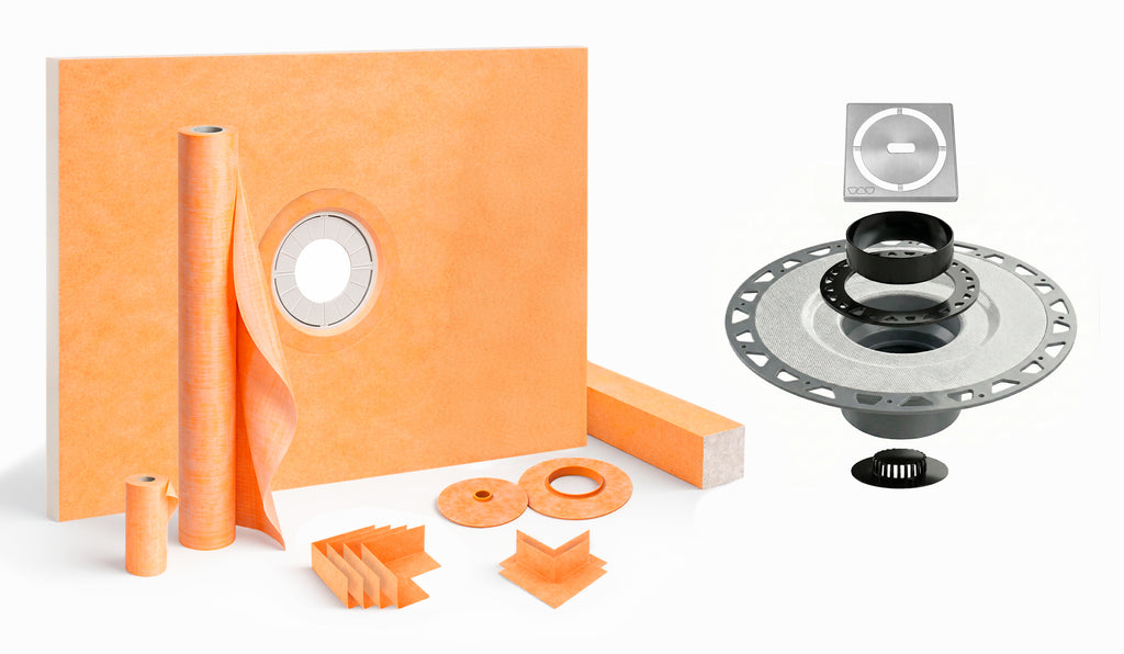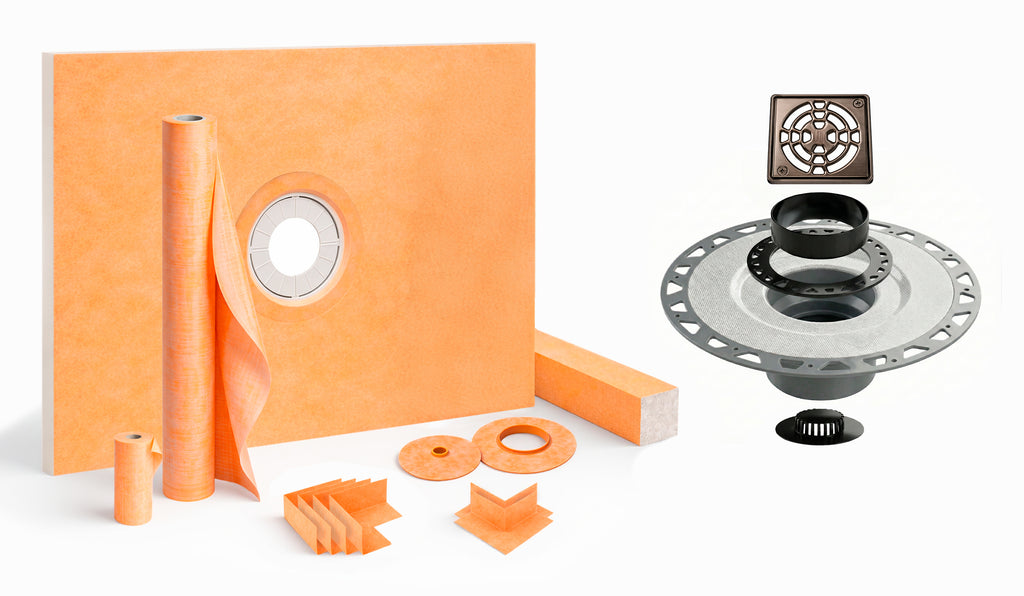 - The shower kit comes with KERDI200/10M membrane which is pliable, sheet applied, bonded waterproofing material for shower and bath surround