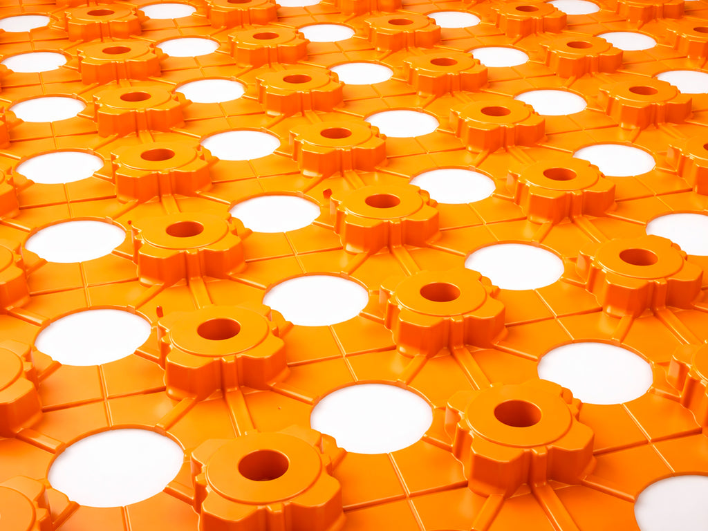 Schluter-BEKOTEC-DRAIN is a modular screed system, designed to form continuous screed surfaces without the need for control joints or additional reinforcement. Under the top layer are a series of drain channels that facilitate the flow of excess moisture out of the underfloor area. Soundproofing qualities are also present, allowing audio to be confined to individual floors of a building. EN23FD10