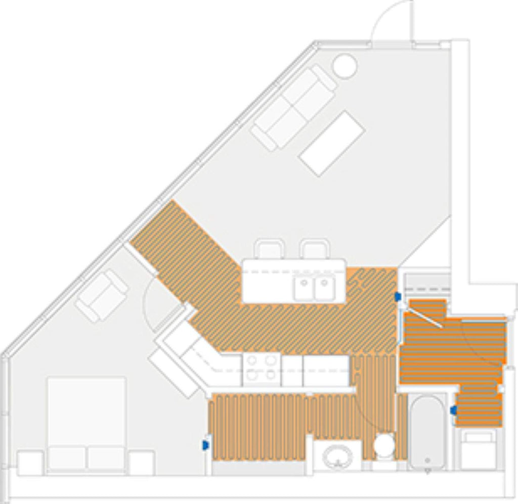 This versatile floor heating mesh is available in a wide range of sizes to cover small bathrooms, large living areas, and uniquely shaped rooms. The mat rolls out easily and can be cut and turned to follow room contours, fit narrow spaces, wrap around obstacles, and accommodate architectural details. Its flexible design lets installers pull the blue heating wire free from the mesh to route around floor vents, benches, or built-ins.